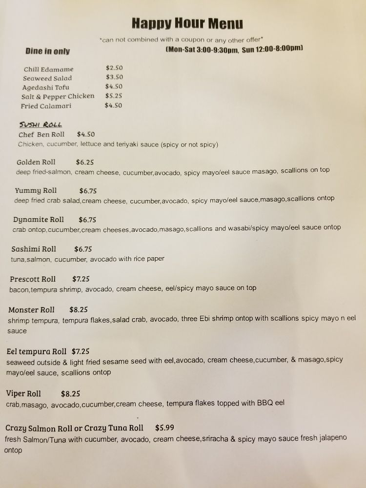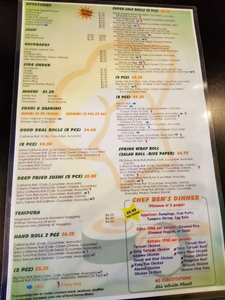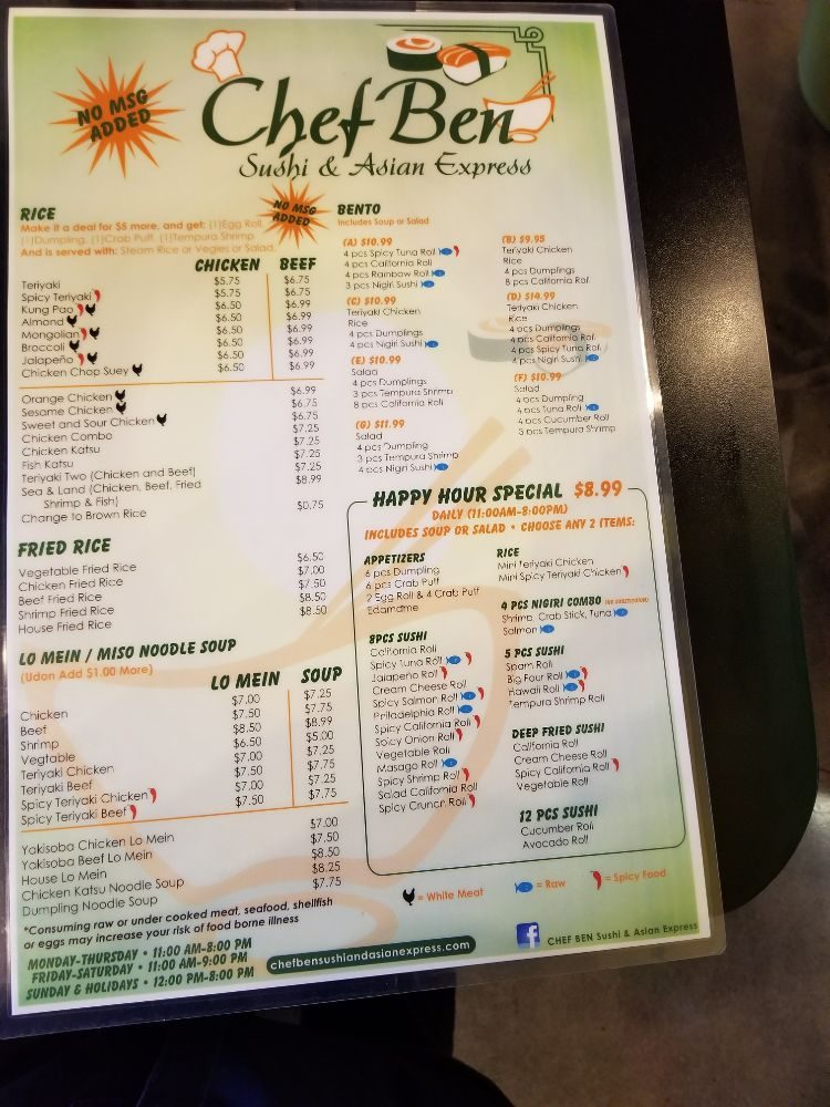 Enhancing the experience, Chef Ben offers outdoor seating, catering, and happy hour specials, making it an excellent choice for groups or families. With convenient payment options and a casual dress code, this place caters to all. Dive into the world of sushi and experience culinary bliss!