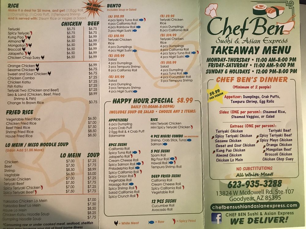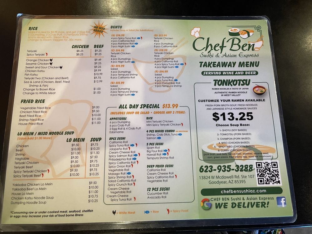 Welcome to Chef Ben Sushi & Asian Express, where the flavors of Japan come alive in a vibrant and casual atmosphere. Located at 13824 W McDowell Rd Ste 107, Goodyear, AZ, this gem offers a delightful mix of sushi and Asian cuisine, perfectly suited for lunch, dinner, or a quick takeout.